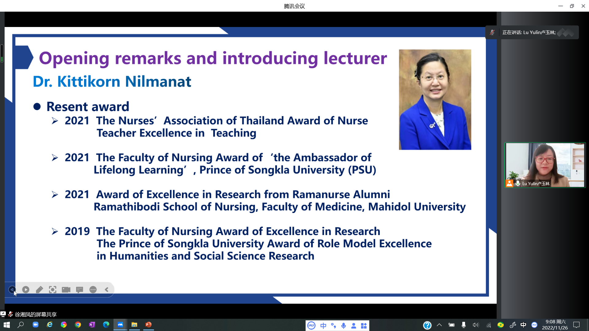 在学校对外合作交流处以及学院领导和老师的支持下,由学院徐湘凤老师主持申报的线上学术交流项目《护理研究质量提高班》和《姑息疗法与癌症护理一体化模式临床研究能力提高班》先后于2022年11月19日和11月26日顺利开班。