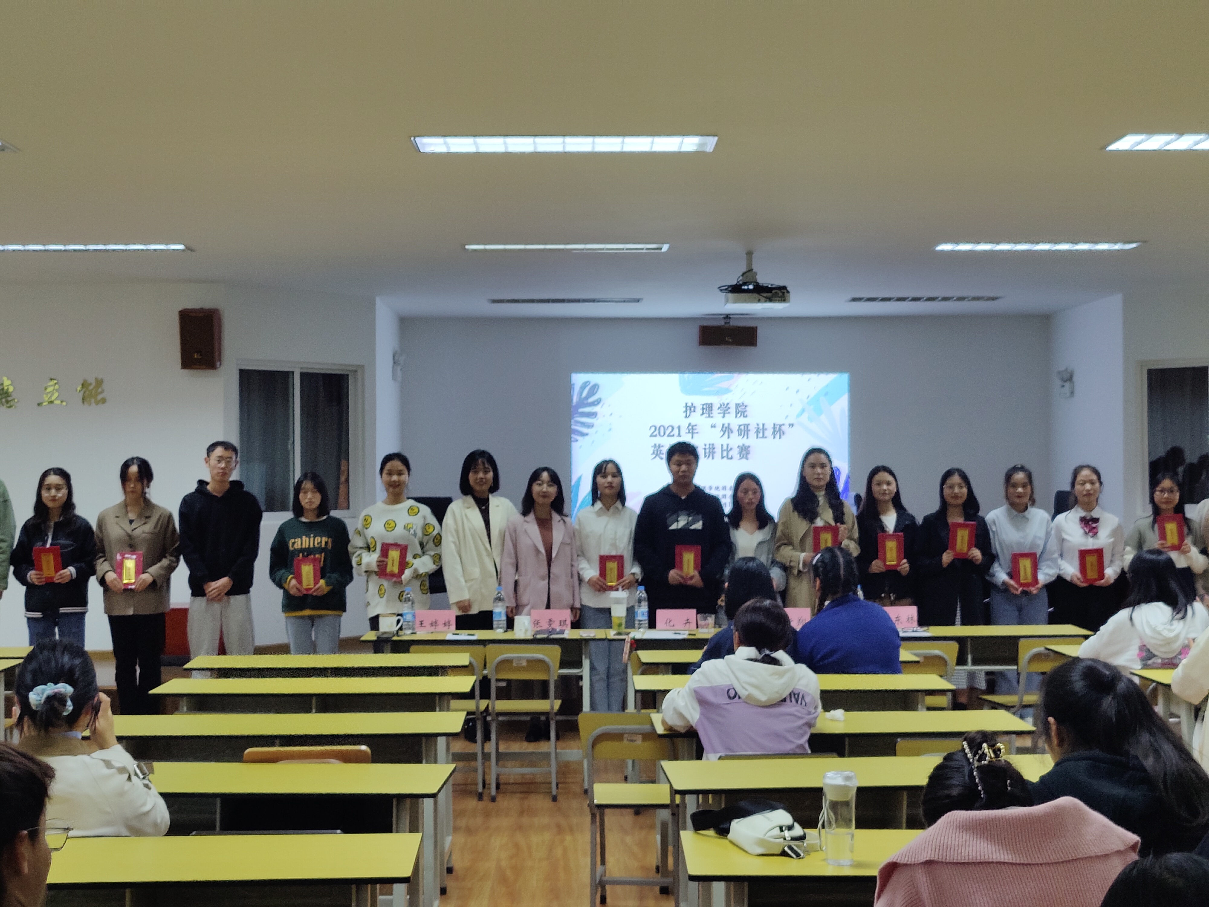在学院党史学习教育中,为提升护理学生英语口语水平和能力,进一步引导学院广大学生传承红色基因、赓续红色血脉,为中国特色社会主义事业培养合格建设者和可靠接班人,2021年10月11日,护理学院2021年“外研社·国才杯”英语演讲比赛在护理楼501报告厅举行,共有来自各班的13名同学参加比赛,护理学院团委书记化卉、教学管理办公室王婷婷、学生工作办公室张雯棋老师及学校口语协会的学生代表葛新翔、刘东林到场担任评委。本活动由护理学院团委主办。
