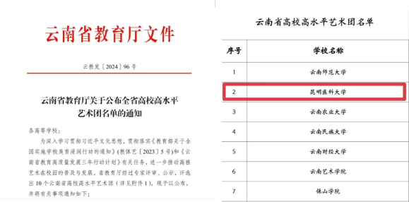 我校大学生艺术团荣获“云南省高校高水平艺术团”称号。下一步,学校将按照《云南省高水平学生艺术团管理办法》相关要求,进一步加强大学生艺术团建设管理,以习近平文化思想为指导,弘扬主旋律,传播正能量,打造具有昆医特色的美育品牌,推动我校美育高质量发展。