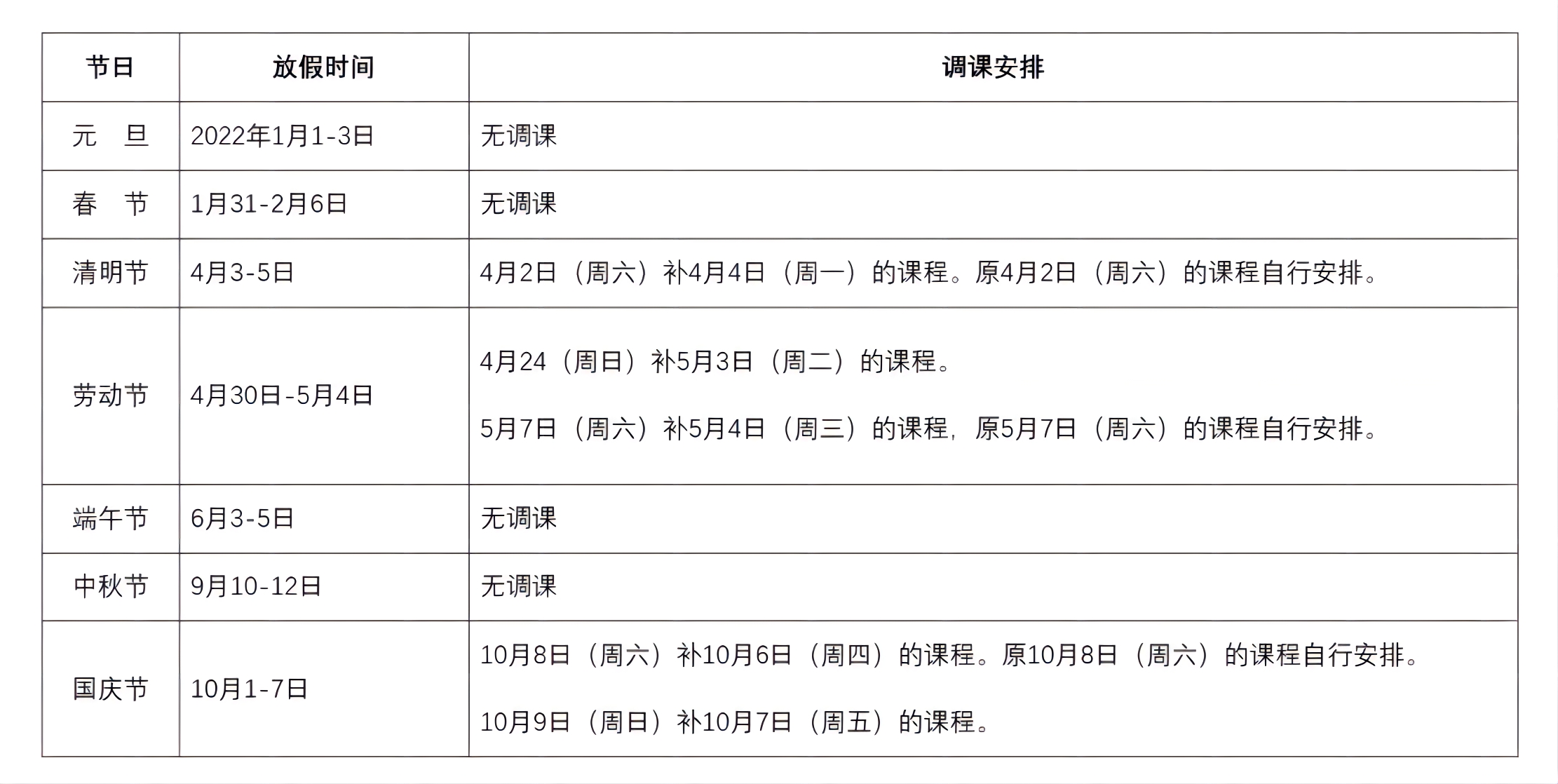 3.放假期间选修课停课,因放假延误的选修课顺延一周。调课期间选修课按上述时间安排上课。