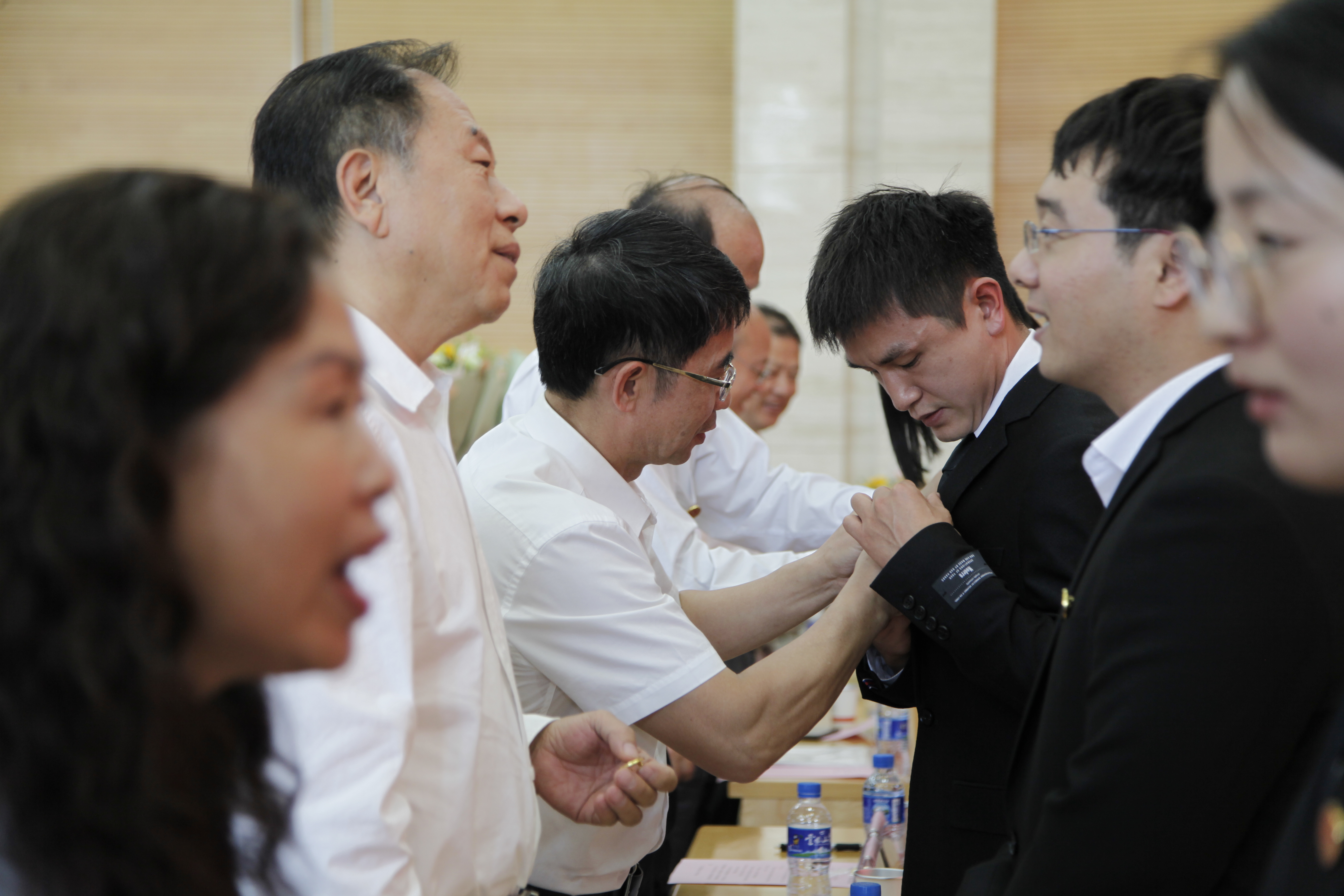 校领导为新进教师代表佩戴校徽。