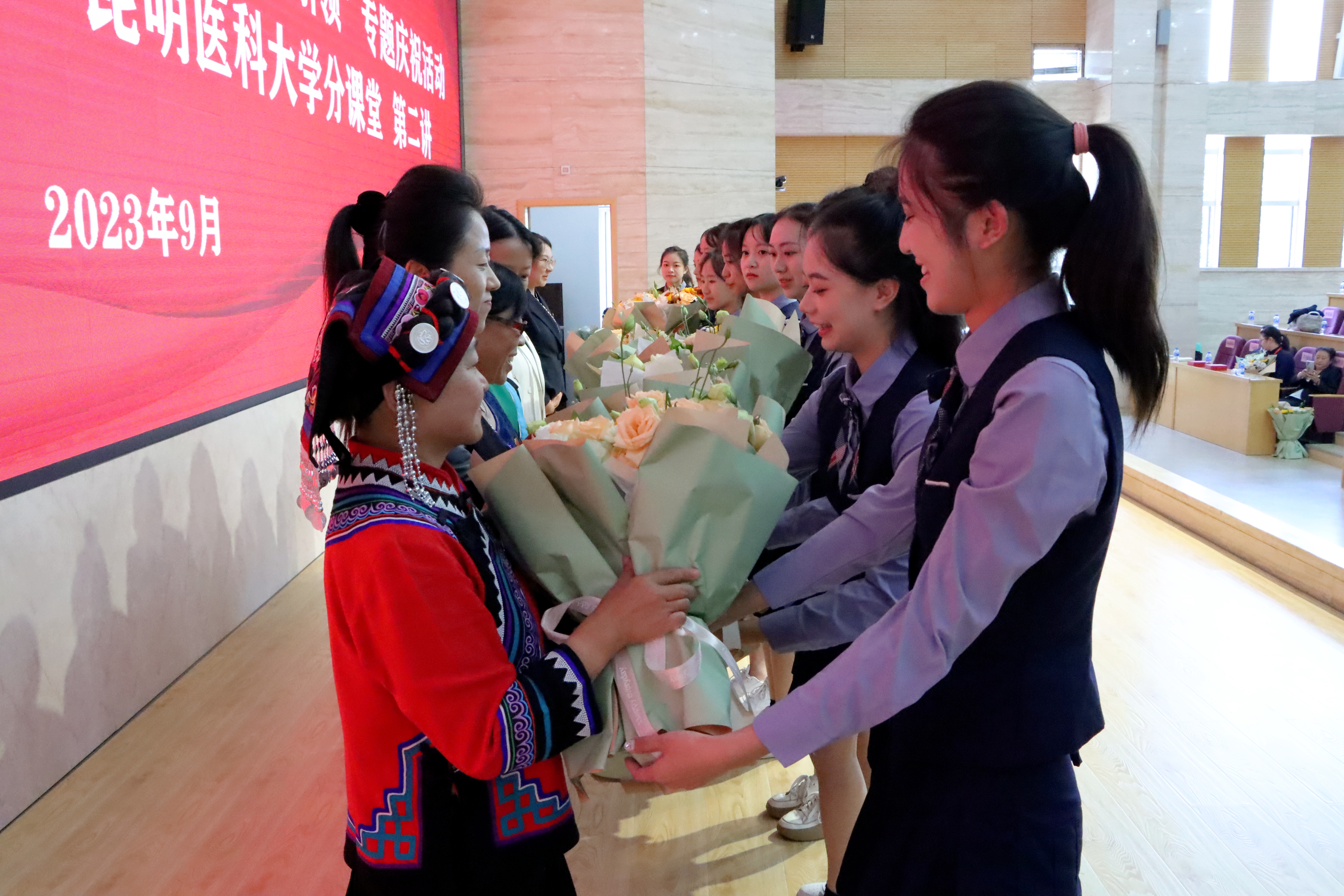 活动还播放了邓前堆医生视频,以及学校劳模人物、学生最喜爱的授课教师、驻村工作队队员相关宣传视频等。学生代表分别向学校劳模人物代表杨照青教授、2023年云南省优秀教师肖媛媛教授、云南省优秀教育工作者邹智荣教授、米兰milan官方网站历届“学生最喜爱的授课教师”以及第四批驻村工作队队员献花。
