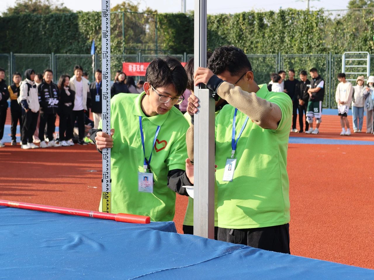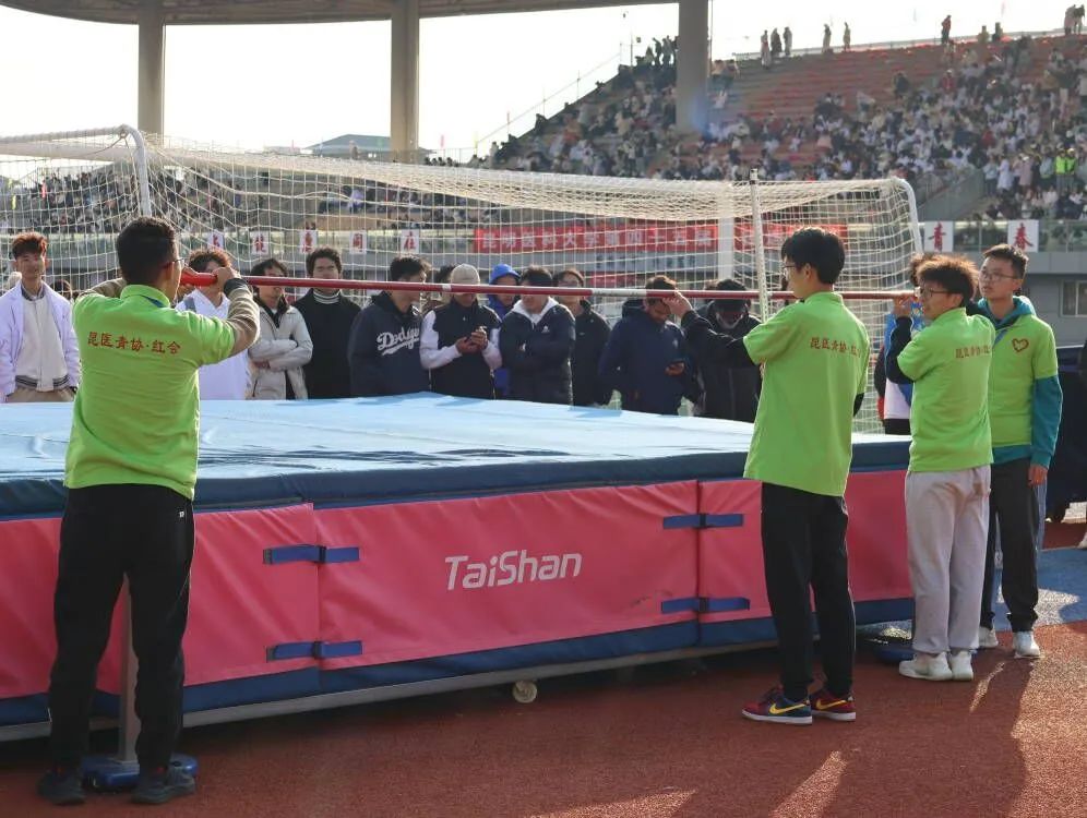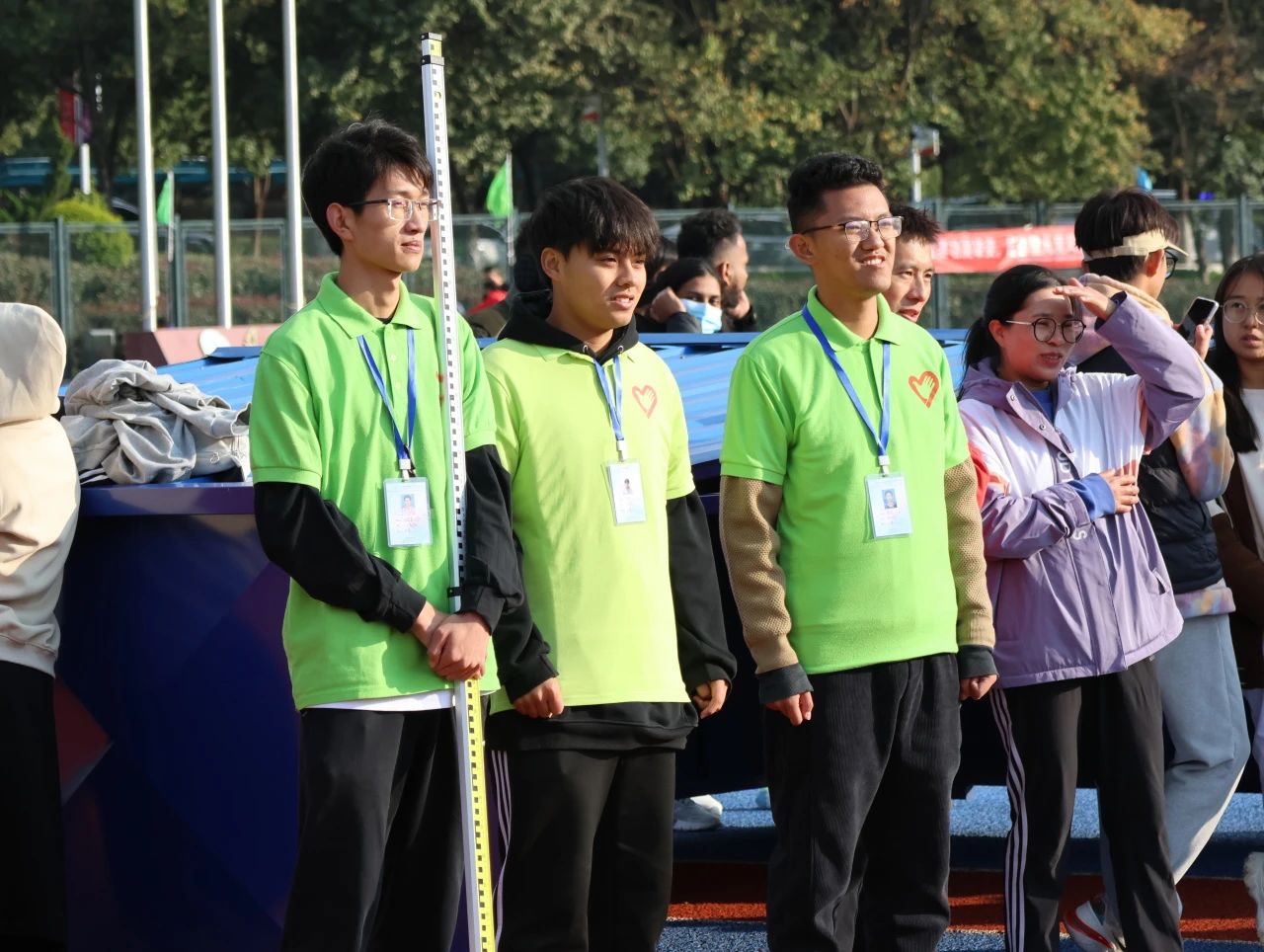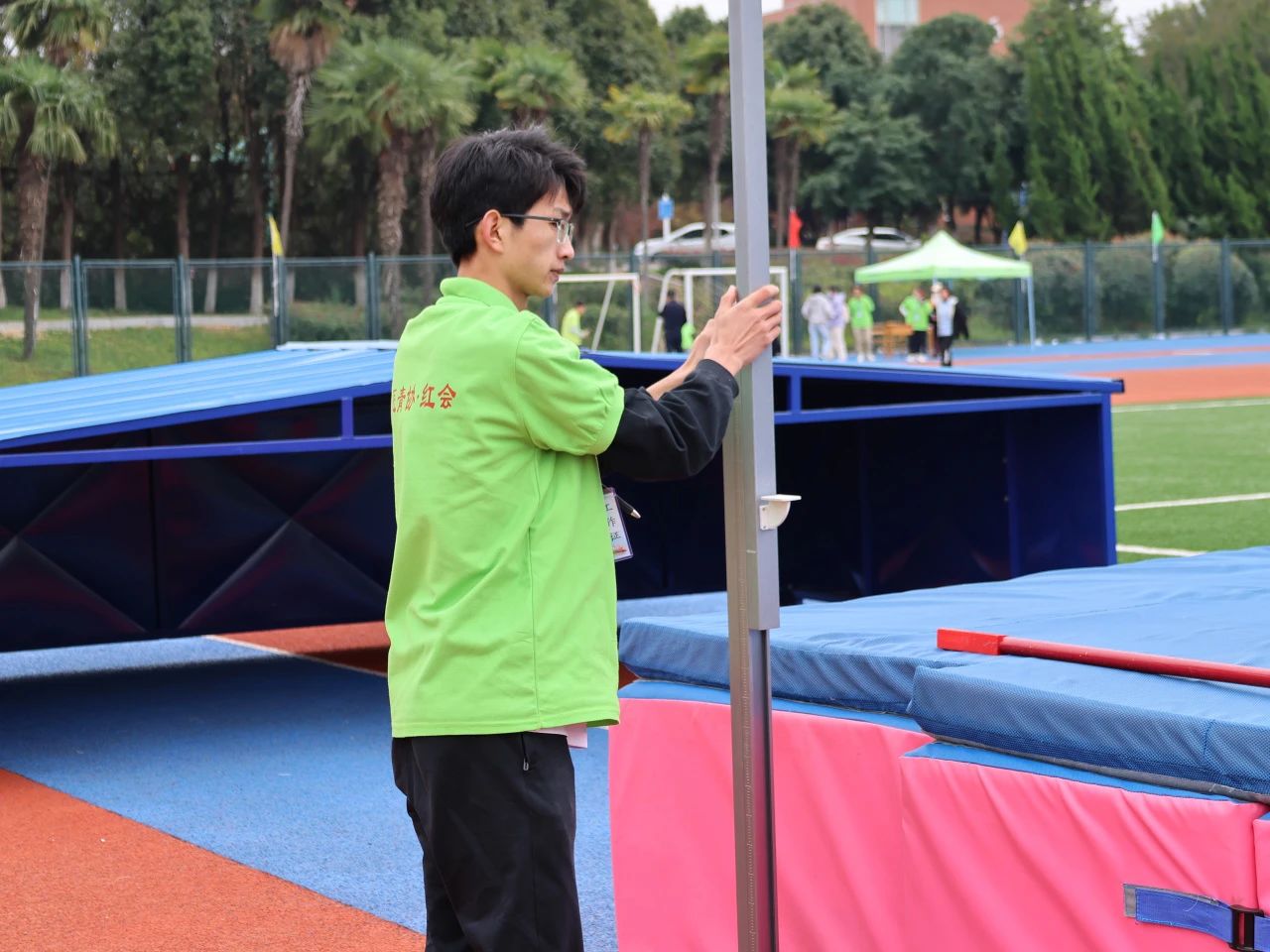 跳高部的志愿者们负责帮运动员们调试比赛器具,整理移位的垫子,播报运动员的比赛顺序同时记录成绩,他们与裁判员及时沟通,与其他志愿者协同合作,保证了比赛顺利进行。