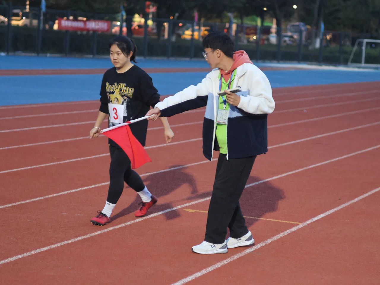 志愿者们需要在铅球落地后及时将小旗钉在落地点,再把铅球送回运动员手里,同时另外两名志愿者负责维持现场,避免其它同学进入到比赛场地而引发安全事故。