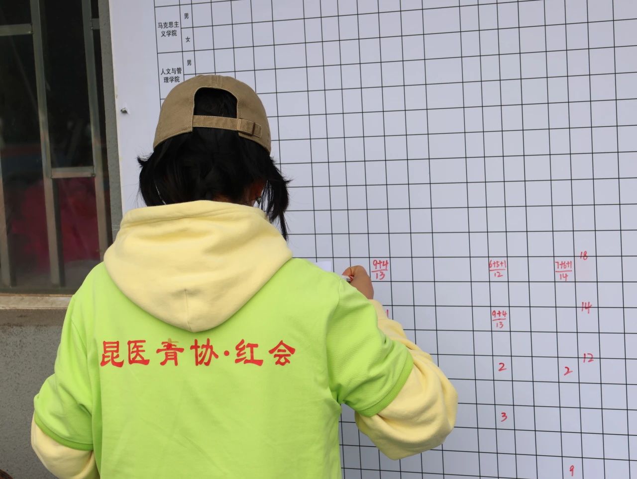 编排记录部的志愿者们及时在信息墙上粘贴比赛日程,记录运动员们的比赛成绩,同时汇总各学院的团体总分,他们恪尽职守,及时更新的成绩让运动员们的脸上绽放了笑容。