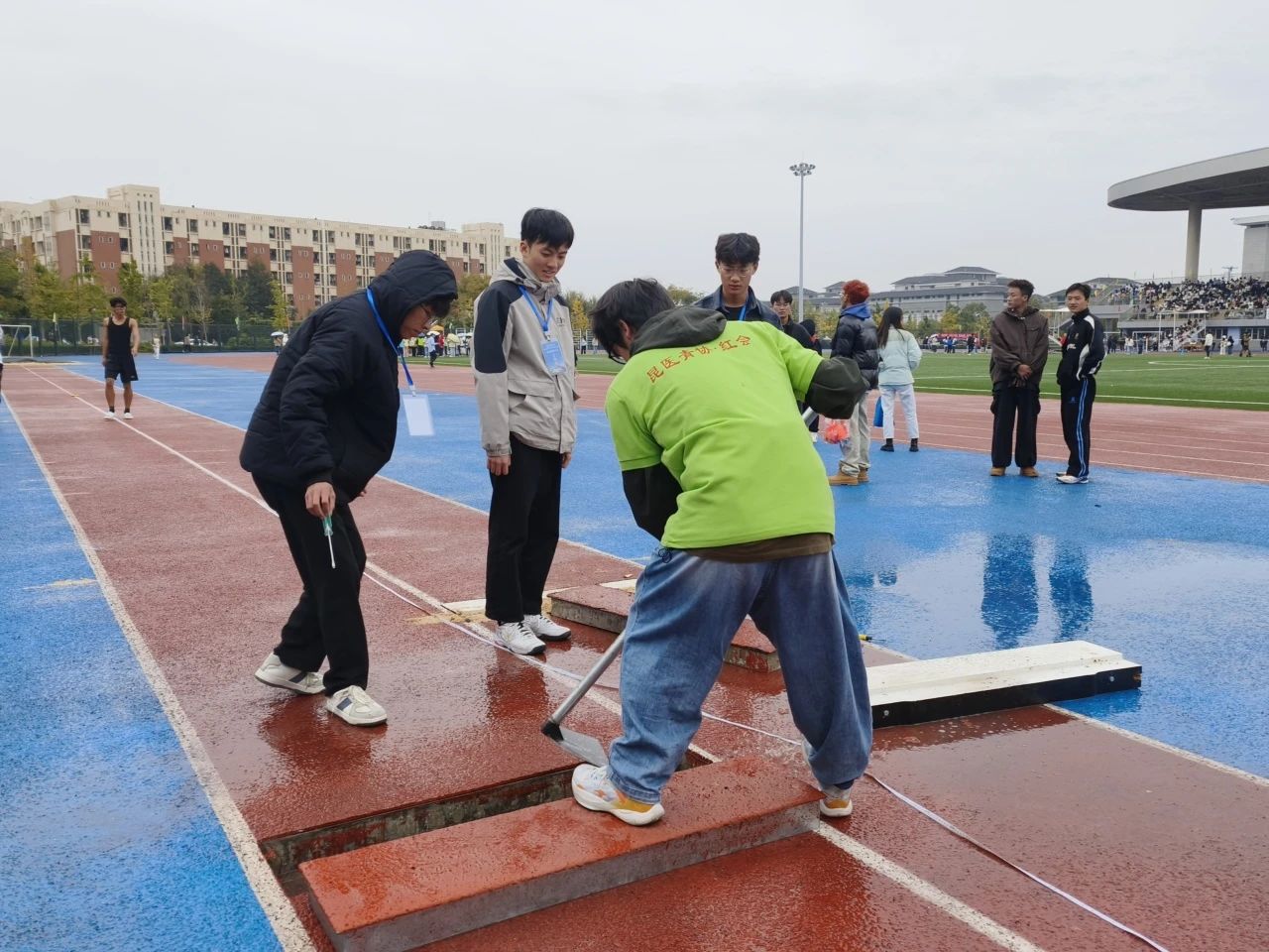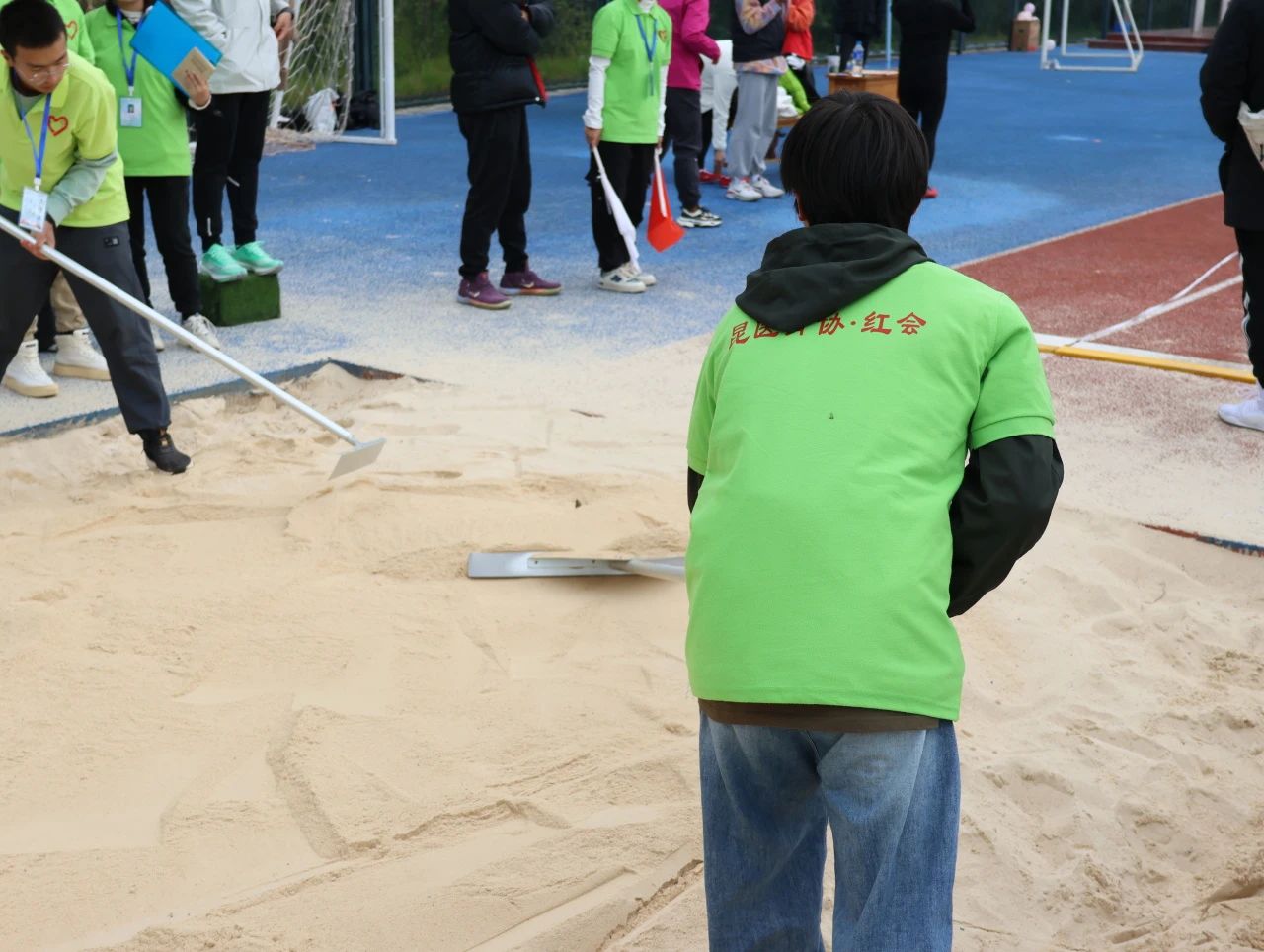 跳远部的志愿者们在运动员完成动作后用小旗标记距离并将沙坑填平,同时记录下运动员的成绩。每一次弯腰,每一次挥铲,都为运动员们增添了一份安心。