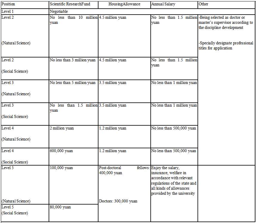 -Talents who meet the requirements of Level 1to Level 3 and complete stipulated tasks will be respectively paid 60,000 /50,000 /40,000 yuan per month. (The above salary should be paid after being evaluated in accordance with the contract or agreement)