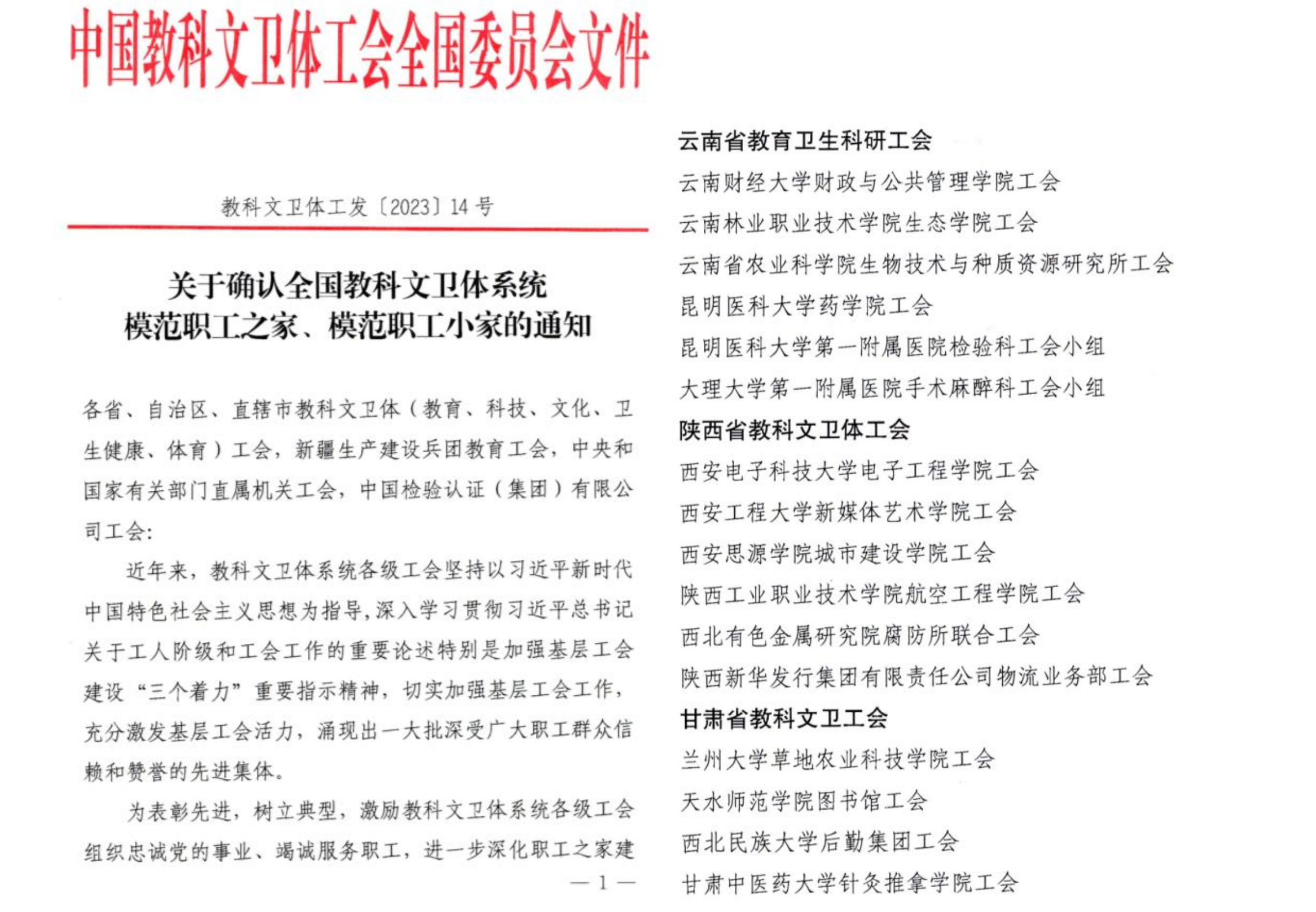 药学院分工会获全国教科文卫体系统模范职工小家荣誉称号